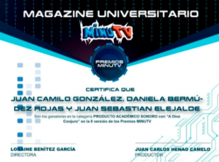 Los estudiantes Juan Camilo González Rayo, Daniela Bermúdez Rojas y Juan Sebastián Elejalde Bastidas obtuvieron el reconocimiento en la categoría: Producto Académico Sonoro con el podcast A Dios conjuro.