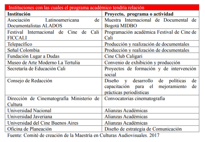 Estos vínculos le permiten a la maestría proyectar hacia distintos sectores de la sociedad sus desarrollos y realizaciones, con el fin de contribuir al análisis, conocimiento y ampliación de las culturas audiovisuales. En efecto, la relación con entidades como ALADOS y el Festival de Cine de Cali abren un espacio a la posibilidad de presentar ante públicos especializados tanto el pensamiento como la producción audiovisual que se generarán en el ámbito de la maestría. Resultados de investigaciones y, a más largo plazo, productos audiovisuales gestados en el seno de la maestría contribuirán en esos escenarios a ampliar la mirada, las categorías de estudio y análisis crítico y las formas expresivas del espacio audiovisual. Asimismo, la relación con canales públicos de televisión como Telepacífico (para el cual se produjo recientemente la serie documental Bajo el mismo cielo, Premio India Catalina en el Festival de Cine de Cartagena 2017 en la modalidad Nuevos Creadores) y Señal Colombia constituye un vehículo de proyección hacia audiencias más amplias para presentar, también a mediano plazo, desarrollos audiovisuales concebidos en el transcurso de la maestría. Por otra parte, las conexiones con instituciones como la Fundación Lugar a Dudas y el Museo de Arte Moderno La Tertulia son un vehículo de proyección hacia el campo de las artes visuales de los avances en materia de investigación. En cuanto a los vínculos con una entidad como la Secretaría de Educación de Cali, se aprecia en ellos la posibilidad de articular la investigación que se adelante en la maestría con la construcción de conocimientos útiles a la gestión pública y al diseño de políticas públicas relacionadas con las culturas audiovisuales. En sentido similar se vislumbra la conexión con una organización como Consejo de Redacción, con la cual se sostienen vínculos alrededor del estudio y del fortalecimiento de prácticas informativas. Además, las relaciones sostenidas a lo largo del tiempo por la Escuela de Comunicación Social con la Dirección de Cinematografía del Ministerio de Cultura permiten identificar un espacio para que proyectos audiovisuales concebidos en la maestría entren en fases de desarrollo en el marco de los programas y las políticas de esa Dirección. Hay que agregar, además, la presencia permanente de la Escuela en la organización y desarrollo de los Encuentros de Investigadores de Cine en Colombia (la V versión, precisamente, organizada y realizada en la Universidad del Valle en 2016), que se ha constituido en la ventana para la divulgación y el debate público sobre la investigación académica acerca de los audiovisuales. Por último, es necesario agregar las alternativas que surjan de la presencia en el Programa académico de profesionales vinculados con medios, entidades públicas y con otras instituciones educativas, quienes en sus condiciones de productores o gestores culturales, de analistas culturales o de docentes e investigadores habrán de replicar en distintos ámbitos los avances que alcancen en la maestría. Todos estos vínculos, pues, son canales a través de los cuales la Maestría en Culturas Audiovisuales espera entregar a la sociedad los distintos tipos de resultados que se obtengan en el ejercicio de sus procesos académicos” (página 73).